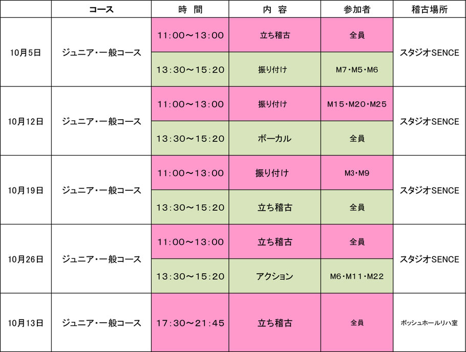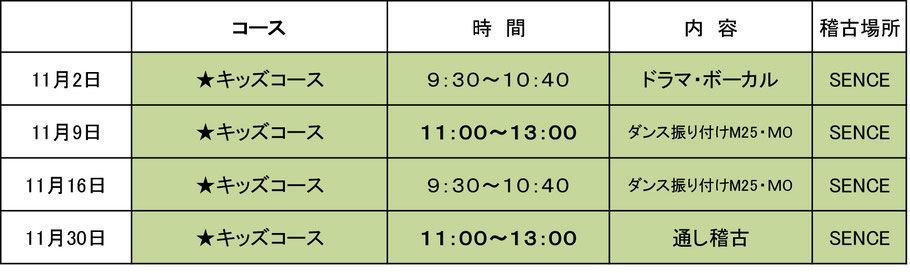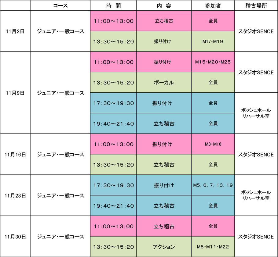 ※11月は9日と30日は稽古時間が11:00~13:00内容は通し稽古です。間違いの無いようにお願いします。 お迎えは13:00です。