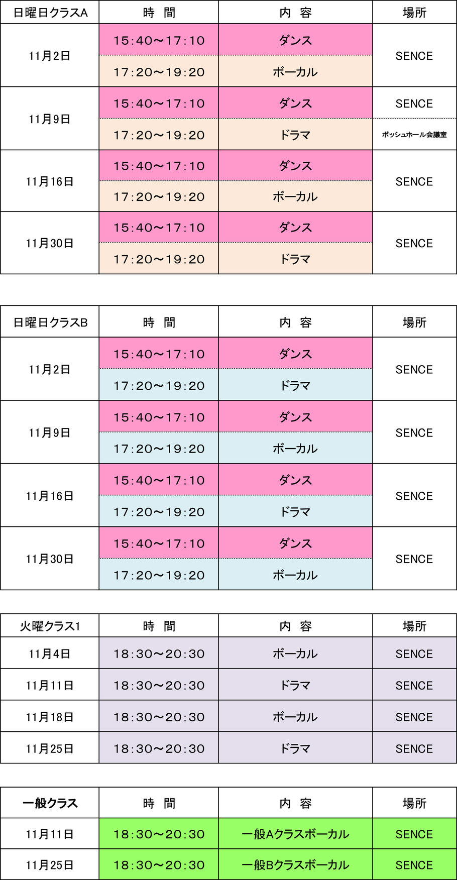 ※11月9日Aクラスのレッスンは、ボッシュホール会議室です。Bクラスのレッスンは、SENCEです。
